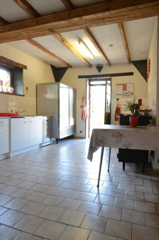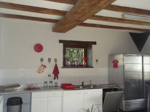La cuisine est située au rez de chaussée et donne sur le salon détente avec cheminée pouvant servir de salle de petit-déjeuner ou de déjeuner.